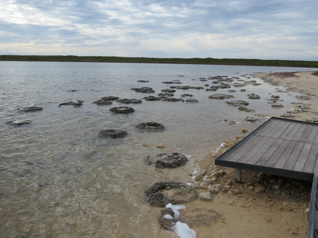 Our next stop was at the Stromatolites. There was a short walk out on a boardwalk to go and see them. While we were walking to the boardwalk, we heard a bird thats ‘call’ sounds like it is saying “did you get drunk, did you get drunk, did you get drunk, did you get drunk…” That was quite interesting to listen to, however we were not able to actually see the bord unfortunately. There were a lot more stromatolites there than at Lake Thesis, where we saw some about a week ago. It was rather engrossing and fascinating. We learnt that the stromatolites are actually made of layers of microbial mats. There is a certain type of slime that encases the stromatolites, protecting it from the sun and also drying out. The stromatolites are about three billion years old which is about 75% of earths geologic history. Cyanobacteria inside the microbial mats has influenced Earth’s evolution by breathing oxygen into the atmosphere.