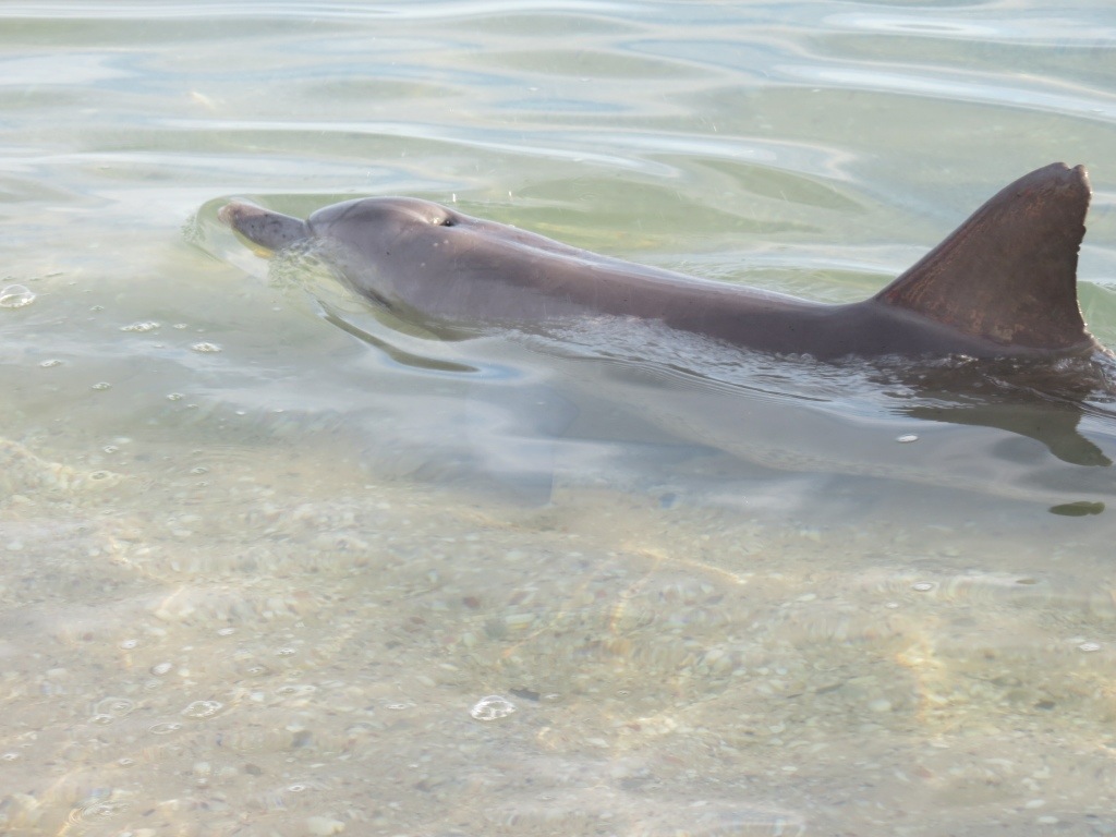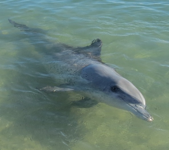 Today we went down to the beach quite early in the morning to watch the dolphin feeding! At first there was only one dolphin, then a few more came. In the end there were about eight. Apparently the most they have ever had in one feeding is 26! It was very exciting to see the dolphins up so close, we were allowed to stand in the water, but just not touch them. We learnt lots of interesting stuff about them as well. Dolphins, like humans, need eight hours sleep, but instead of one big block they sleep for a few minutes or seconds at a time through out the day. When they sleep, they only shut down half of their brain, because, unlike humans, they have to think about breathing. This is also why you can’t put a dolphin under anaesthetic, because that shuts down both sides of the brain, that mean that the dolphin would not breath. Dolphins can also sleep with one eye open, to watch out for sharks. The people here only feed the female dolphins, because the males can be too aggressive with each other, and also humans. The people here feed the dolphins three times a day, and they have named each dolphin. They can tell who is who by their fins, often it is the scars on the fins from shark attacks. Dolphins live for about forty years.