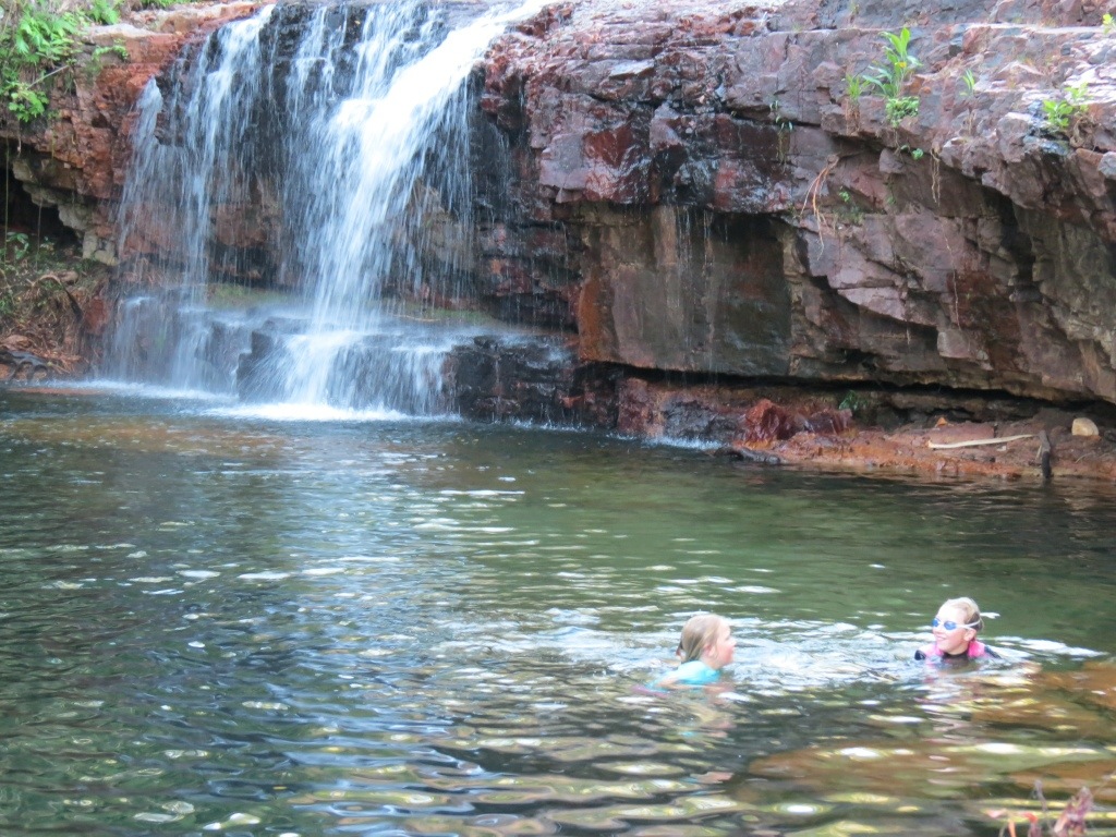 We got up for a quick breakfast before hitting the road to go to Litchfield National Park. We tried to take a short cut but got a bit lost on a narrow road so it ended up not being a short cut at all! The Safari Camp was pretty much as we remembered it. We got a site near to the one we had last time we were here, but a much bigger one. We also had a camp fire pit and plenty of shade. We set up and had a read for a while before going on a long walk to finally reach the swimming holes called the Cascades. It was very shallow but when we walked a bit further we found a much deeper, better pool. We had great fun but eventually had to go to beat the sunset! We got back and had fish called threadfin salmon that we bought in Adelaide River at a market. We cooked it on the camp fire. It was very nice.