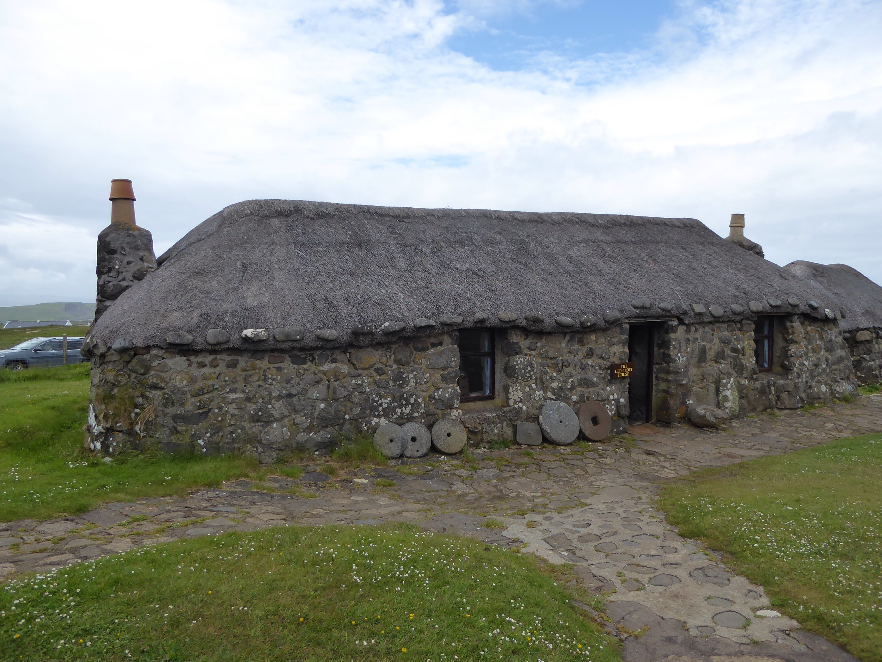 Today we went sight seeing. We drove around the island – literally! First, after a lovely breakfast we drove for a while until we reached Skye Museum of Island Life, a village of preserved thatched buildings and barns that show how the crofters lived in the 18th and 19th centuries. It was very interesting as it showed what life was like back then. After that we went to a whisky distillery – Talisker, where we went on a tour that told us how they make it. That was not very interesting for Tara and I but Mum and Dad liked it. Although it was a cloudy, drizzly Scottish summers day the scenery was beautiful! For dinner we went across the road from our hotel to a small Spanish restaurant, that was very nice.