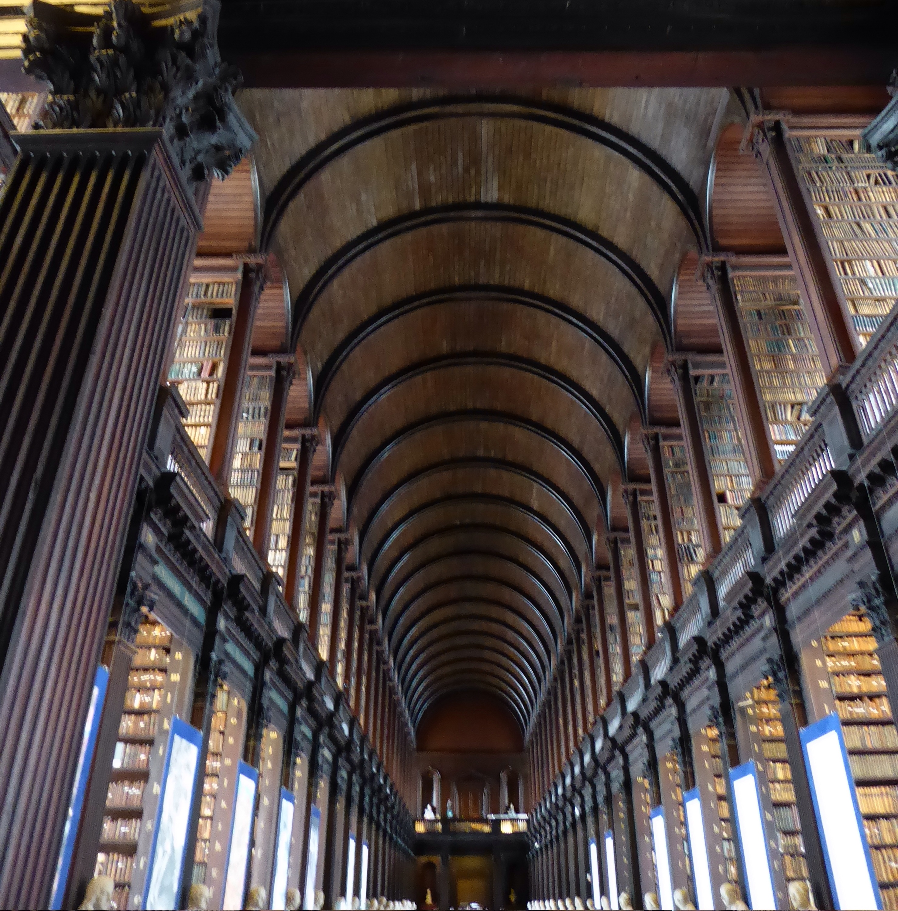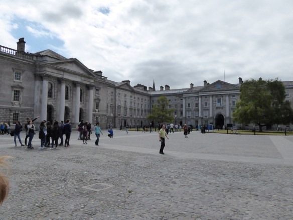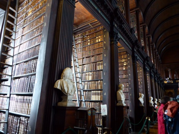 Ireland!!!  We left the hotel early for our 9:50am flight to Dublin. We went through customs then had breakfast at a cafe in Heathrow terminal 2.  The flight only took an hour so we had the afternoon in Dublin. We picked up our hire car and, guess what, we were upgraded to the same type of car we had in the UK. It was a Nissan Qashqai just without all the bells and whistles like GPS and parking sensors we had on the last car. This one was brand new – 10kms on the clock! We went first to the hotel then onto a hop on hop off sight seeing bus. We went to see Trinity college and the Book of Kells. The book was made by monks in the 9th century. There was also a very old library from the 17th century that has the books organised in size order! We had dinner at the hotel pub which also had some live Irish music – I gave Mum and Dad a 10.30 curfew and we went up to our room early!