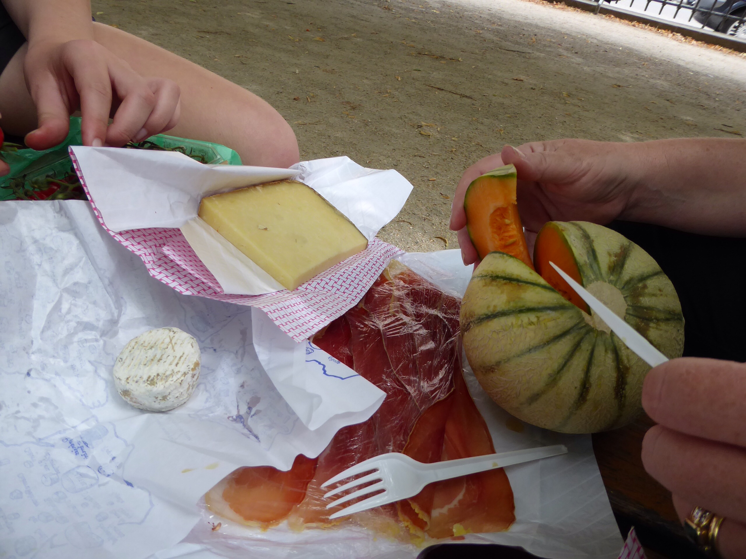 For lunch we had lots of cheese, prosciutto, tomatoes, olives, balsamic onions, baguettes and canteloupe.