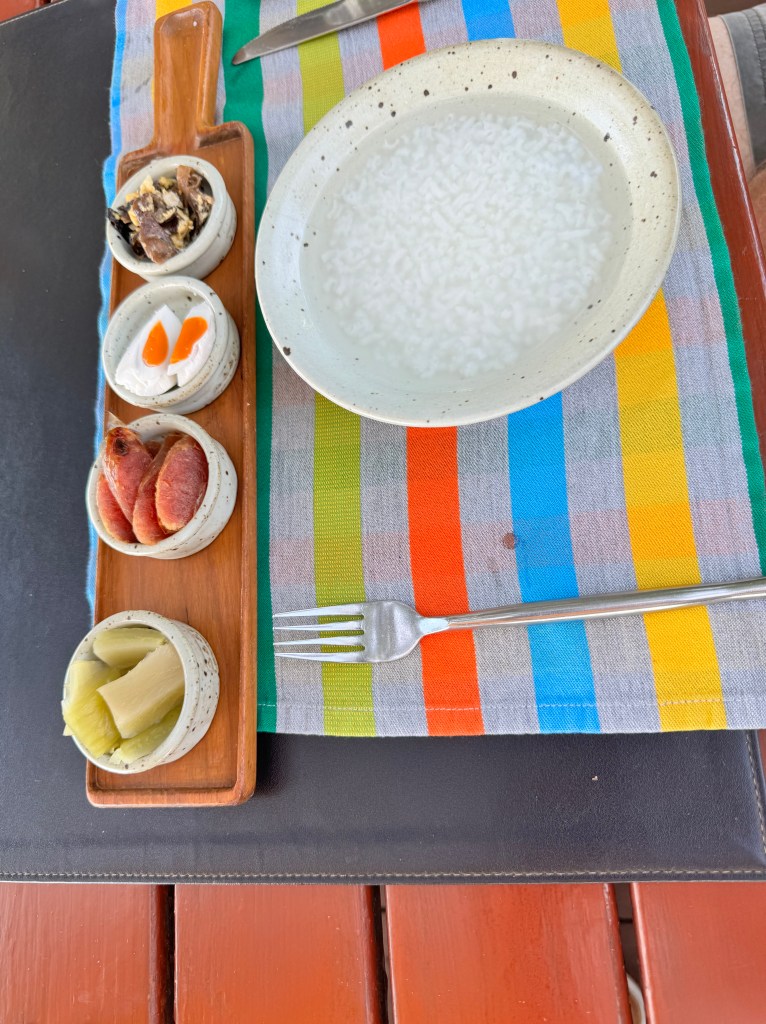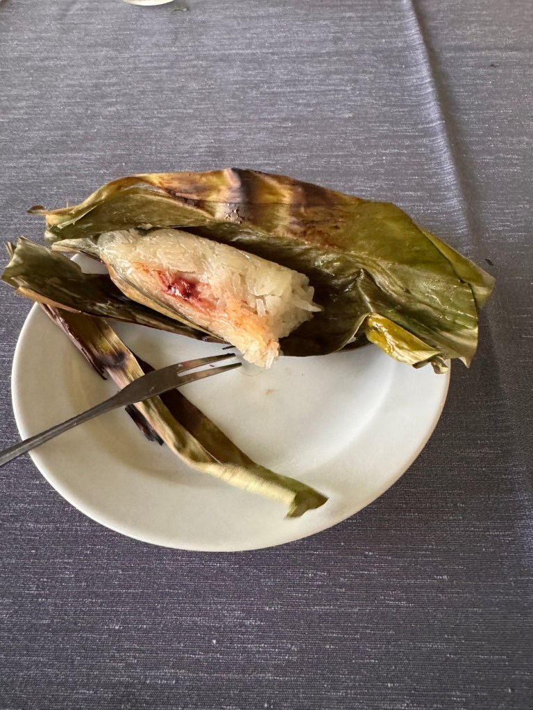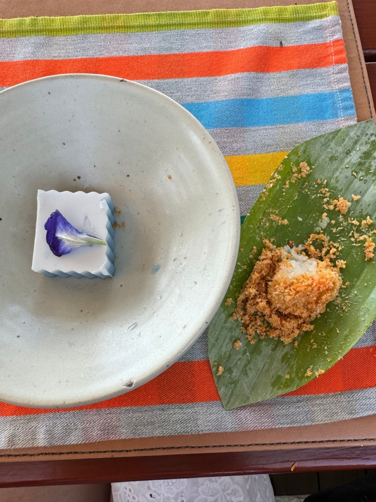 Our breakfast dessert today was coconut pudding and the sweet salmon with sticky rice.