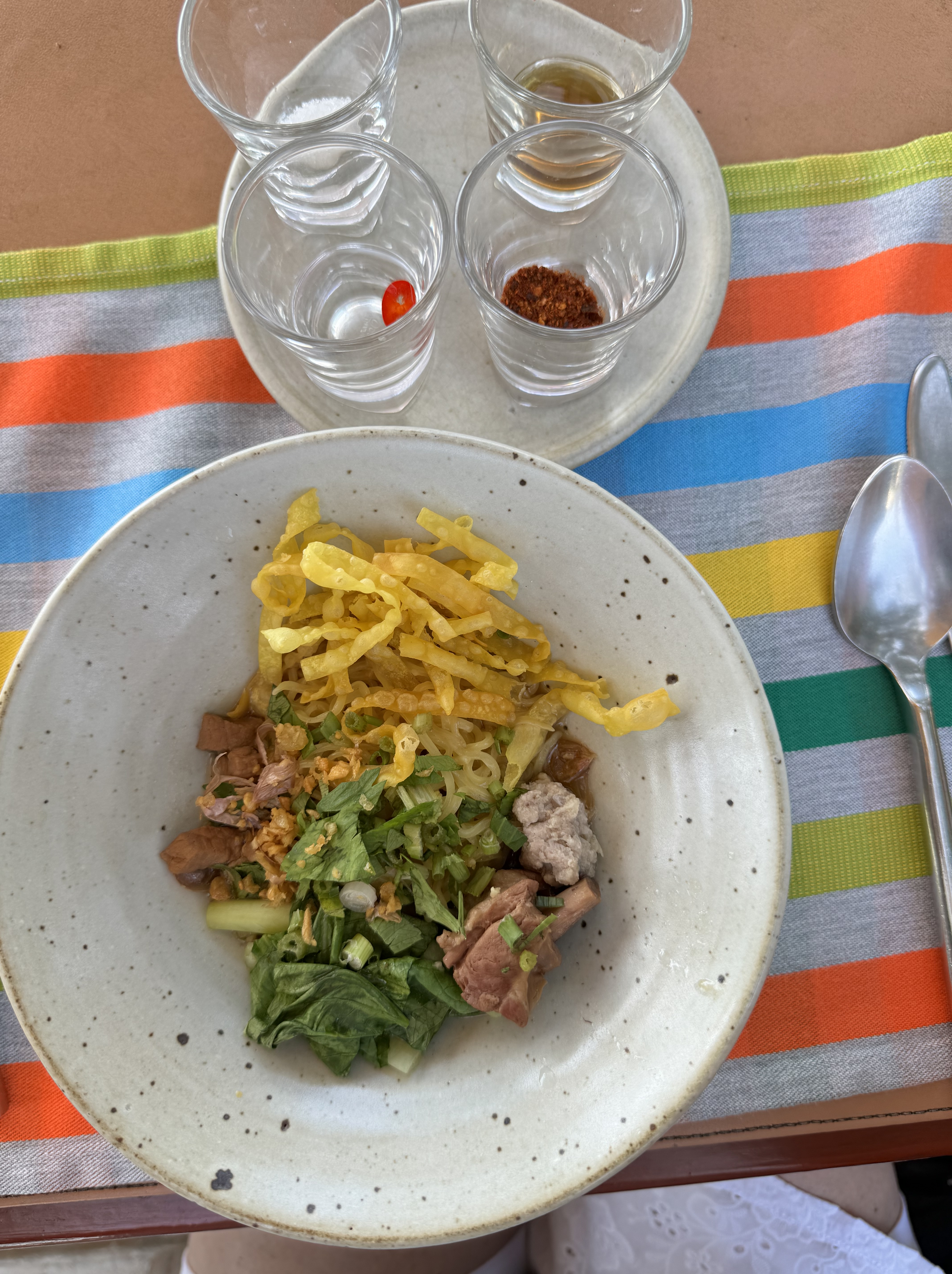 This was a pork noodle breakfast dish with shot glasses of Fish Sauce, Vinegar, Chilli and Sugar for mixing in as desired.