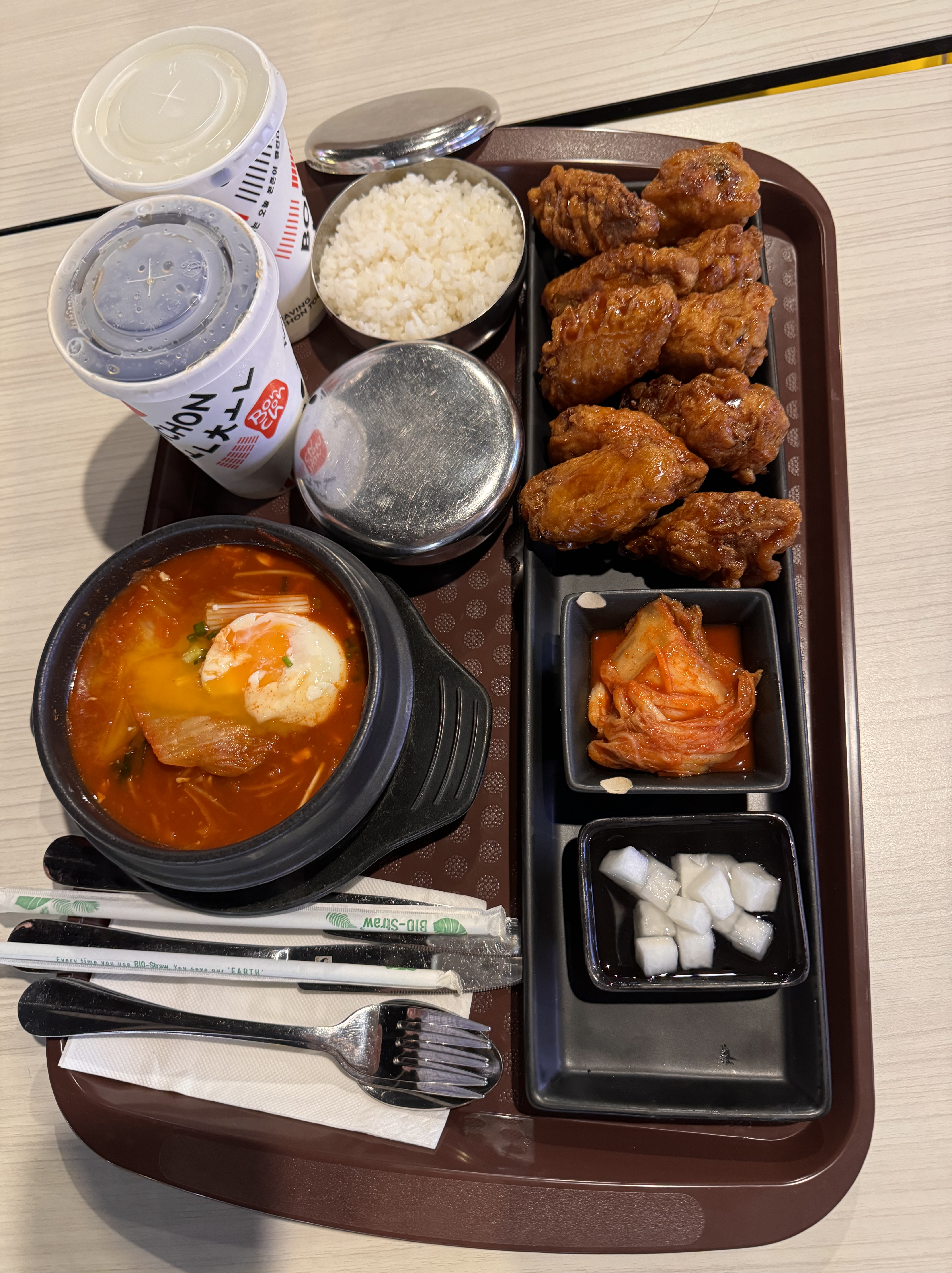 This Bon Chon pack included a soupy dish with an egg in it, Chicken Wings, Kimchi and pickled radish along with rice and drinks.