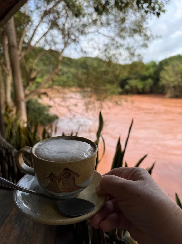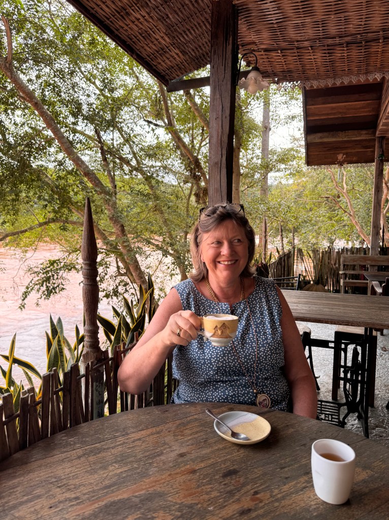 Flooding in Nan has subsided enough for us to go on a day trip today. First stop is a coffee shop at Nan Riverside Art Gallery. The coffee was good and a herbal tea of some sort was served along side it. We could see how high the flood waters were and the river was still flowing rapidly.