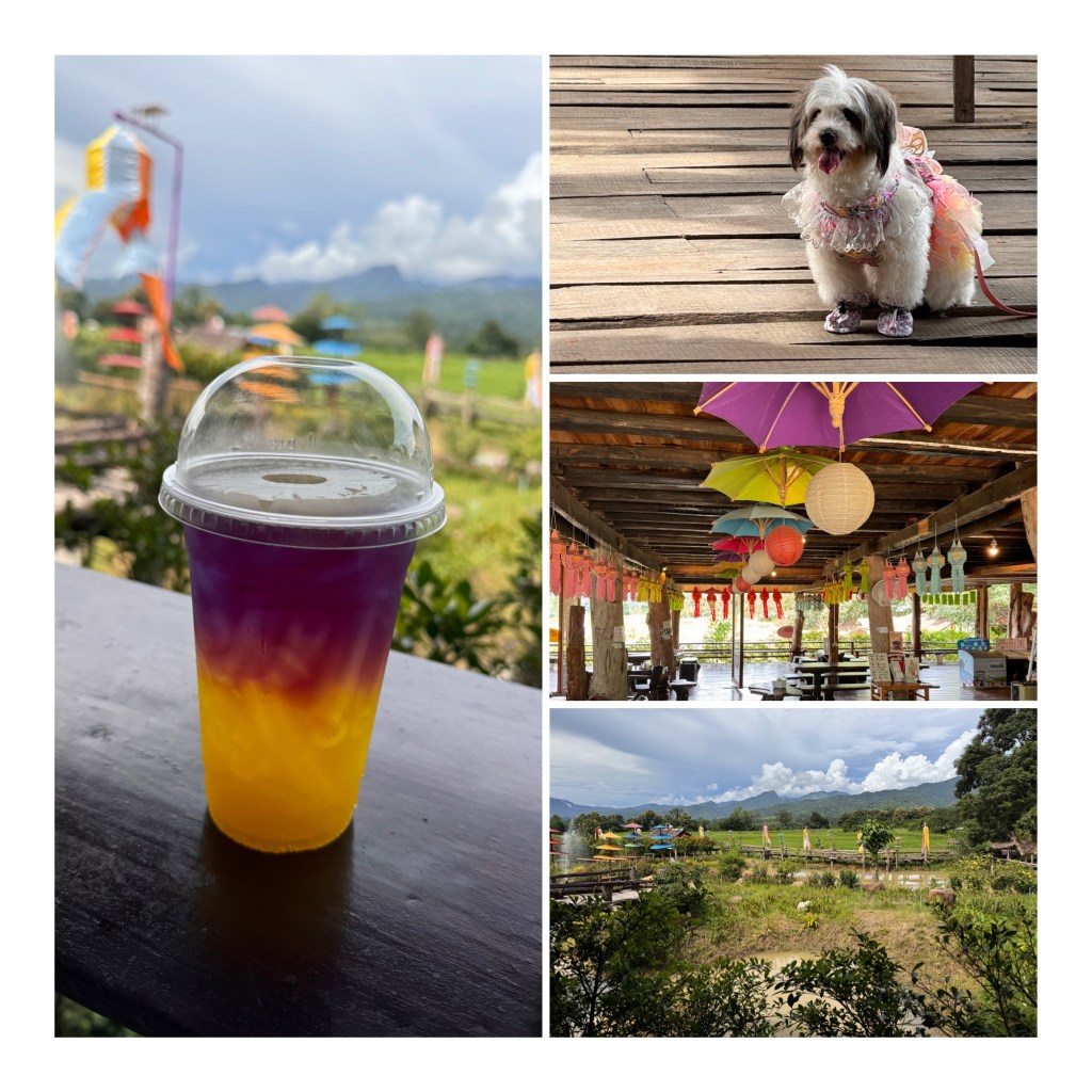 A purple butterfly pea flower and pineapple drink, a dog in shoes and a tu tu, and the view from the coffee shop.